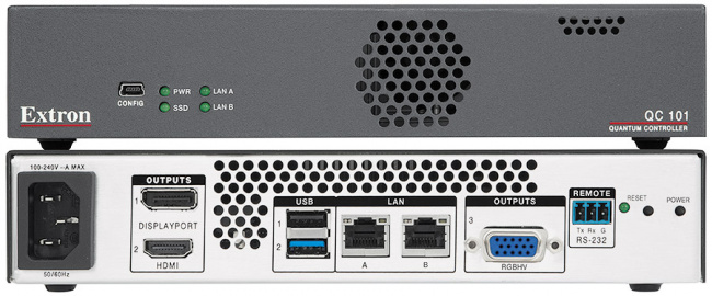 QC 101 E и QC 101 C от Extron – это контроллеры, специально разработанные для процессоров видеостен Quantum® Elite и Quantum Connect. Они поставляются в компактном формфакторе, со встроенной операционной системой и предварительно установленным на накопителе программным обеспечением для управления Quantum. QC 101 представляет собой альтернативу традиционному ПК – компактную, надёжную, простую в установке и лёгкую в использовании. Конфигурации процессора Quantum можно настроить как сразу с помощью QC 101, так и на компьютере с дальнейшей передачей на QC 101. Для установки и настройки QC 101 к устройству подключаются дисплей, клавиатура и мышка, которые после пусконаладки системы могут быть отключены. Для упрощения работы с видеостеной QC 101 легко интегрируется с системой управления. До восьми процессоров Quantum Elite для крупных видеостен могут контролироваться одним устройством QC 101 E при подключении через сетевой коммутатор.