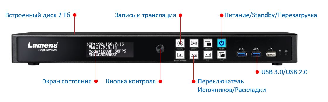 | IP источник / USB камера | Lumens IP поворотная / корпусная камера RTSP источник (H.264 1080p 60/30fps) USB камера (MJPEG 1080p 30fps) |
