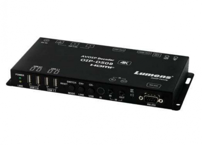 Lumens® OIP-D50D AV over IP декодер доставляет сигнал 4K @30Hz со сверхнизкой задержкой и визуальным отсутствием потерь по кабелю категории 5e/6/7. OIPD50D создает гибкие, высокотехнологичные и экономически эффективные профессиональные AV решения. Он эффективен для применения в таких сферах, как спортивные бары, кампусы, храмы и т.д.